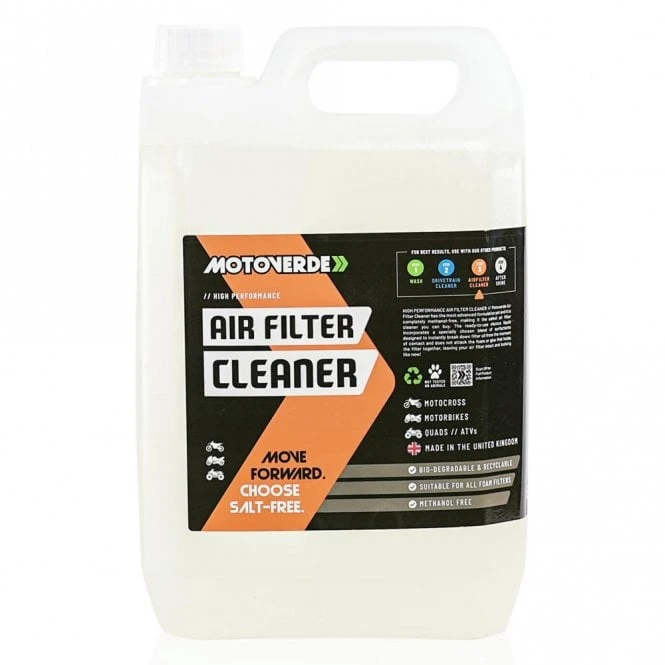 - Motoverde Air Filter Cleaner is 100% methanol-free, meaning it does not attack the foam or glue that holds the filter together, making it the safest air filter cleaner on the market!