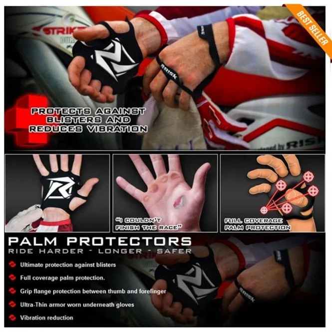 In order to create the necessary armor, Risk Racing has produced the Palm Protectors. Palm Protectors are a very thin, protective layer offering full coverage protection of the palm as well as the saddle area between the index finger and thumb. The Palm Protectors also aid in reducing the dreaded “Arm Pump” by absorbing vibration transferred through the handlebars. Worn under the gloves, riders don’t even notice the ultra thin Palm Protectors, but they do recognise the vibration reduction and much needed protection against blisters. Motocross racers, trail riders, and road racers alike can benefit from the Palm Protectors.